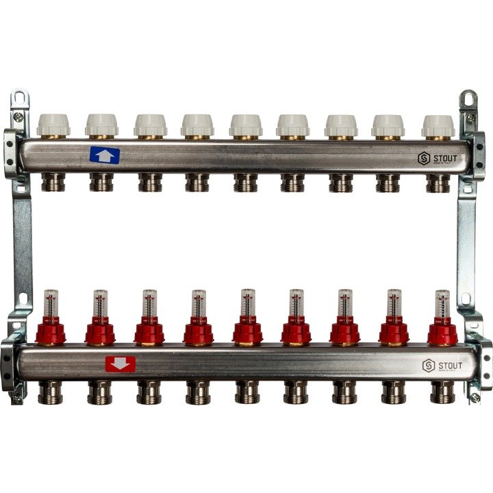 Купить Коллектор Stout из нержавеющей стали с расходомерами 9 вых. по цене 25365 руб. в Екатеринбурге вы можете в интернет-магазине «Мир Котлов». Большой выбор котлов, радиаторов, водонагревателей, комплектующих. Доставка по городу и РФ, самовывоз. Услуги монтажа.